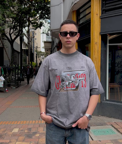Camiseta unisex de estilo urbano con un diseño gráfico llamativo. Está confeccionada en algodón de color gris lavado que le da un efecto vintage o desgastado. En el centro presenta un gráfico grande de un pegaso metálico alado, sobre una letra "E" tridimensional y el texto rojo "GENERATION 3". En la parte superior del gráfico, se leen las palabras "ALPHA" y "OMEGA", reforzando una estética futurista y simbólica. El corte es oversize, con mangas amplias y caída relajada, ideal para looks modernos y cómodos. Perfecta para combinar con jeans, joggers o pantalones cargo.