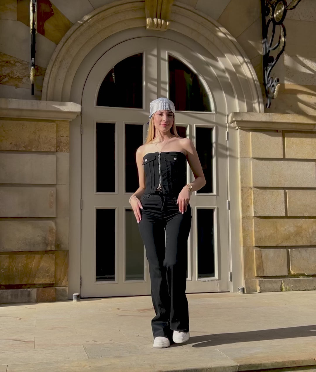 Jean flare negro de tiro alto, confeccionado en denim con ajuste ceñido en cadera y muslos que se abre en un elegante corte acampanado. Presenta un detalle distintivo de tela lateral en blonda, que aporta un toque femenino y sofisticado, ideal para crear looks versátiles con un aire moderno y chic.