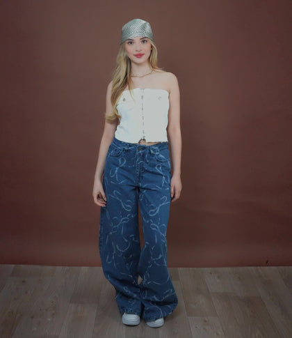 Jean wide leg Rigido de tiro alto, confeccionado en denim azul con diseño estampado de lazos en tono más claro, que aporta un toque moderno y distintivo. Presenta silueta amplia y recta desde la cadera hasta el bajo, brindando comodidad y movimiento. Cuenta con bolsillos delanteros y traseros funcionales, cierre con cremallera y botón metálico. Ideal para looks casuales con un toque de estilo urbano y contemporáneo.